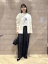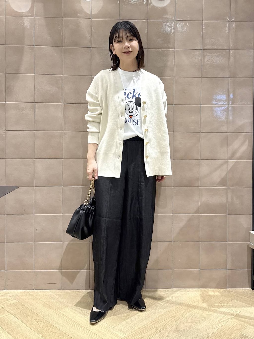 あたたかくなってきたので カーディガンも羽織で◎ ミッキーTをはずしでカジュアルに入れて、 艶パンツと小物で大人感を♡