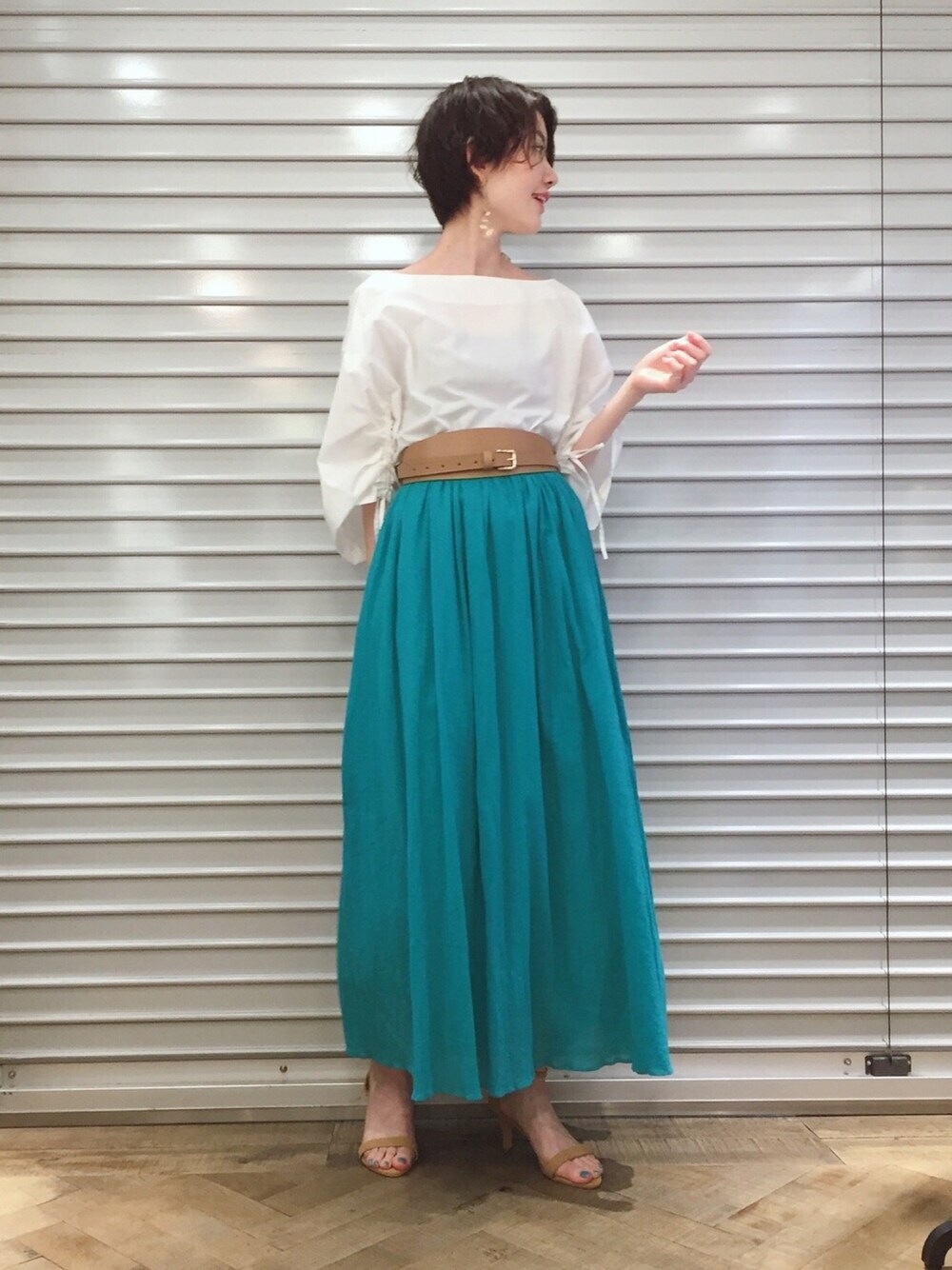 白ブラウスにカラースカートは、 今季、抑えておきたいコーディネートです😏 綺麗目小物で合わせれば、 休日のお出かけにも使えそう...❤︎