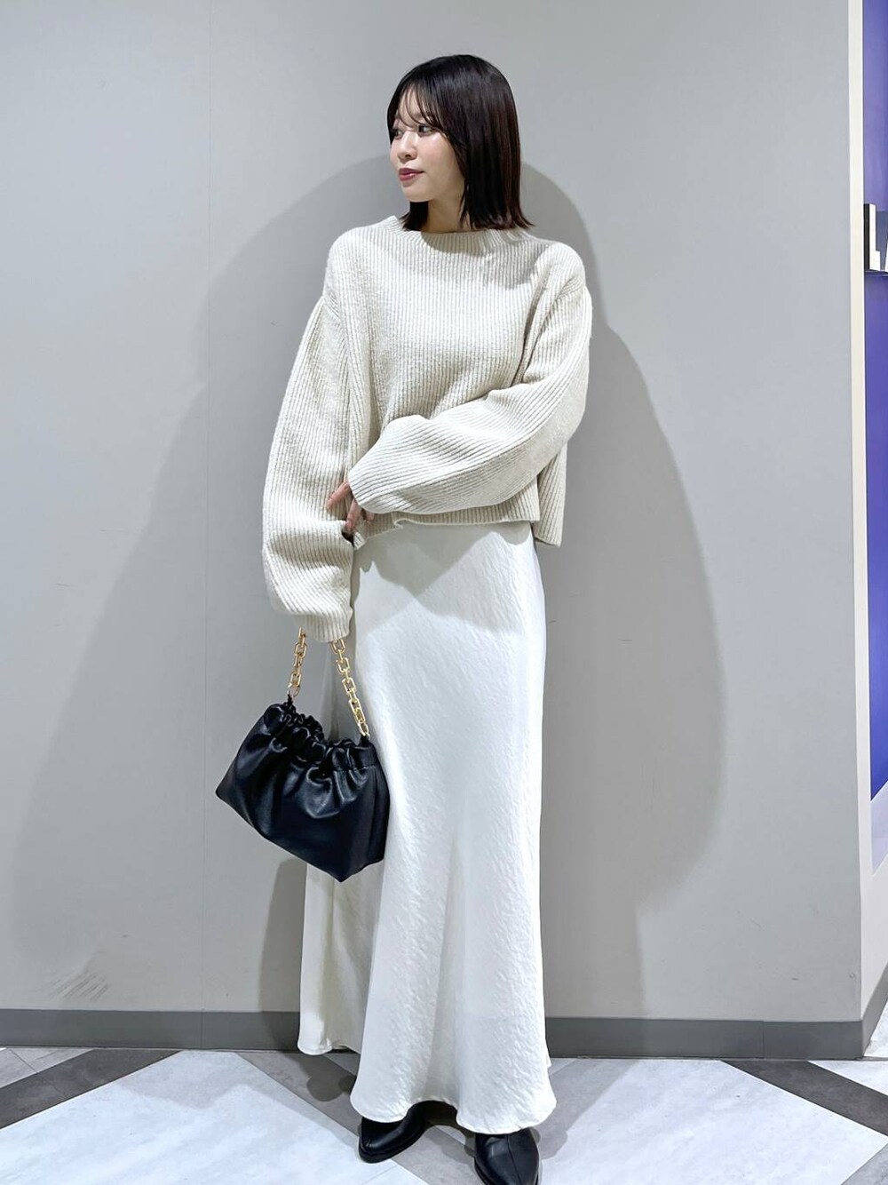 きれいめワントーンコーデ☃️ 春まで使えるアイテムです☘️ ニットは腰丈なのでスカートもパンツも合わせやすいです ツヤ系のスカートはオールシーズンはけます!