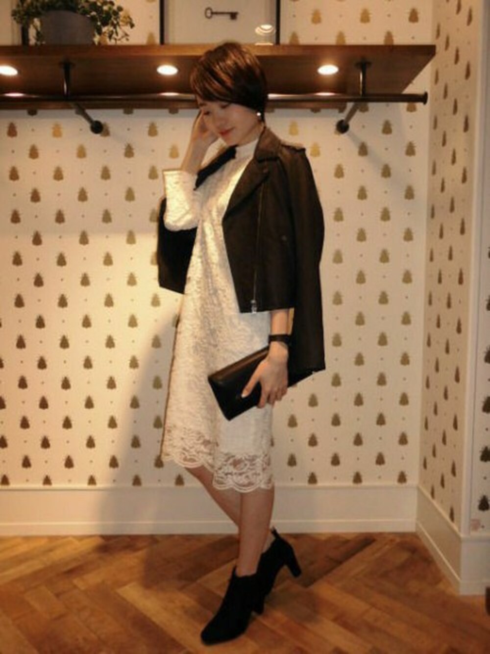 パーティーシーンにオススメのコーディネート 今年らしい総レースのワンピースはコンパクトなサイズ感がポイントです♪ マットな質感のライダースと合わせて、バランスの取れたコーディネートに。 小物は黒で揃えるとクラシカルな雰囲気で◎