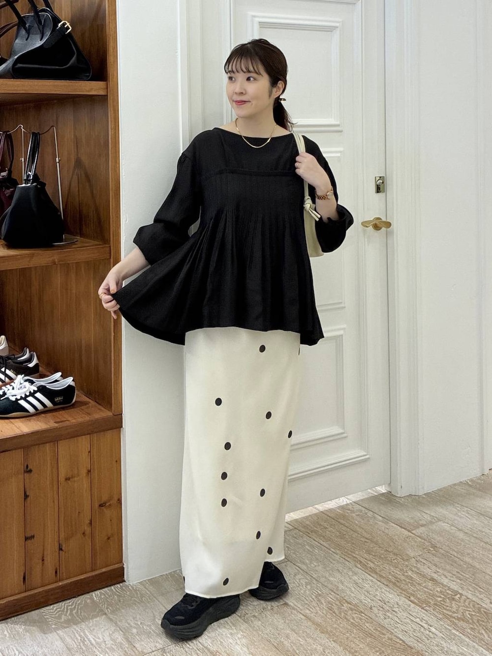 👕おすすめポイント  ̄ ̄ ̄ ̄ ̄ ̄ ̄ ̄ ̄ ̄ ̄ ̄ ̄ ̄ ̄ ̄ ̄ ●ブラウス たっぷりタックが入った着映えデザイン! 胸の高い位置に切り替えと 丈の前後差があるので脚長に見えるのと 生地がわりとしっかりしているので スケスケにならないのが🙆♀️ お仕事からお休みまで着回しできます! ●スカート ウエストオールゴムでとっても楽ちんなスカート! 裏地もあって透けにくいのと しわになりにくいです✨ 程よりナローシルエットで 体のラインを拾いにくいのが嬉しい!  ̄ ̄ ̄ ̄ ̄ ̄ ̄ ̄ ̄ ̄ ̄ ̄ ̄ ̄ ̄ ̄ ̄