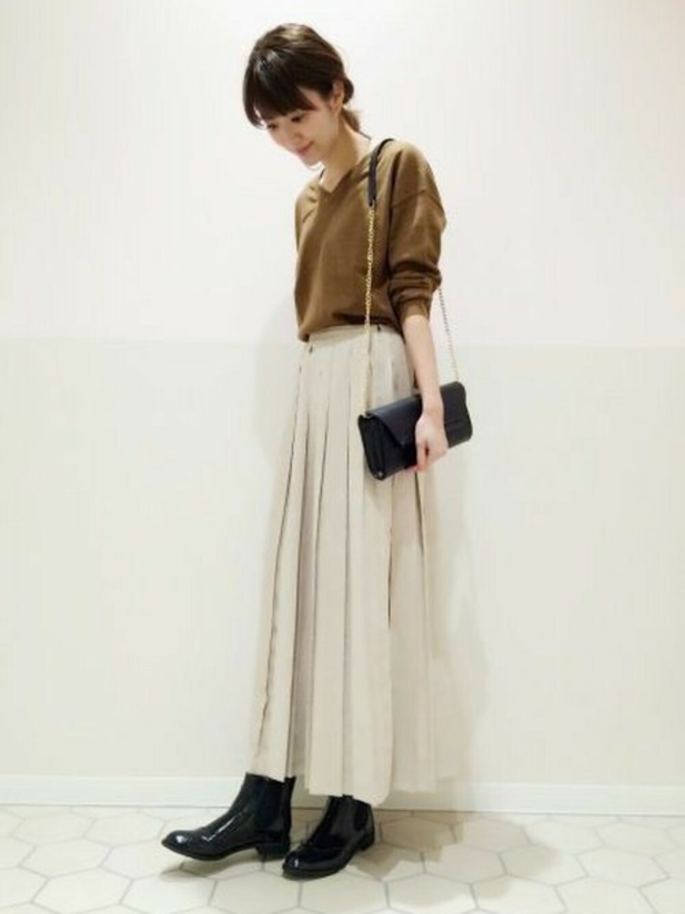 トレンドのプリーツスカートを合わせたスタイリング♪ キャメルに薄いベージュの色味を合わせてこなれ感をプラス☆