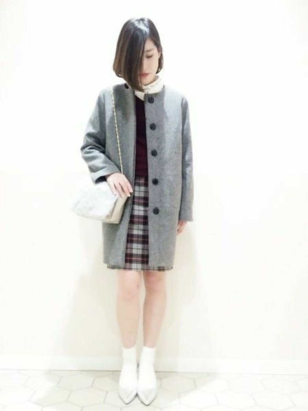 クリスマスパーティースタイル♪ シックな印象のコートのインはボルドーで気分を盛り上げて☆☆ ワントーンで今年らしく!