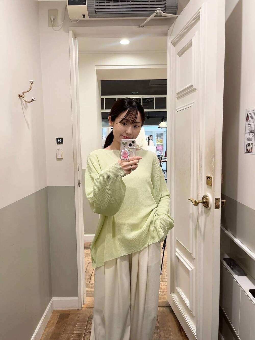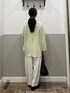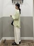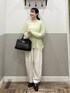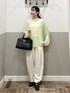 【ニット】 ゆるっとしたシルエットがラフで可愛いニット。 シアー素材で透け感があるのでインナーとの相性を 楽しめます。シャリ感のある素材で清涼感があります。 【パンツ】 落ち感のあるスラックス素材のパンツ。 コクーンシルエットで履くだけでオシャレ見えします。