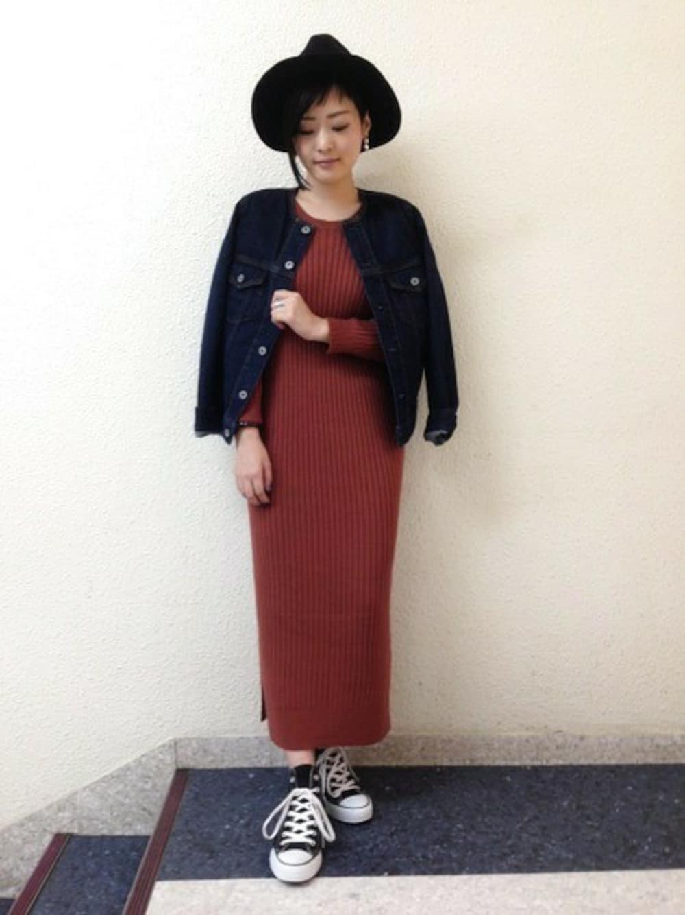 今期注目カラーのテラコッタは肌なじみが良く、 女性らしい雰囲気に仕上げてくれます。 Gジャン×スニーカーでカジュアル要素も取り入れました。