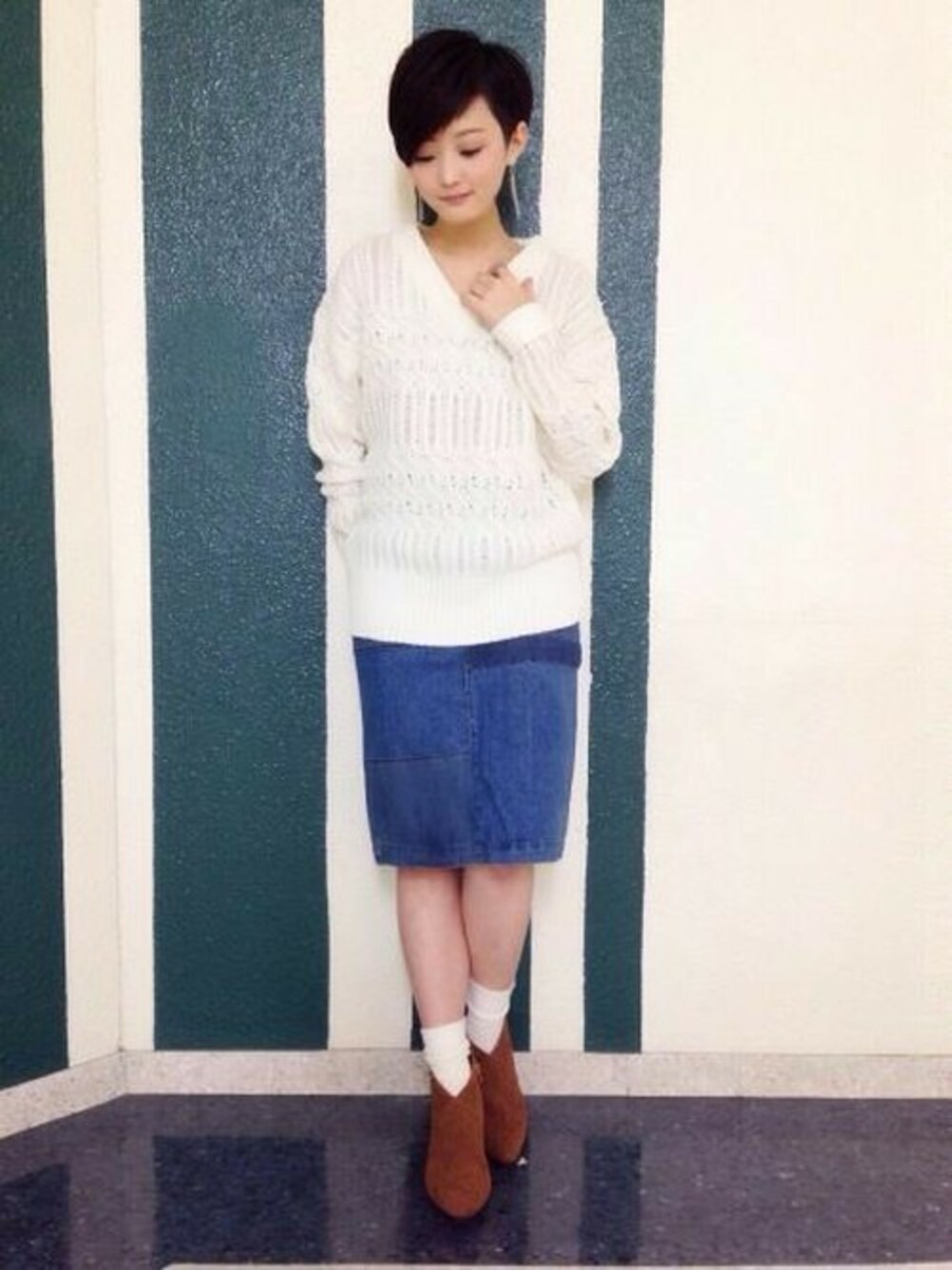 ケーブルのざっくり編みニットは女性らしさ満載です!! 甘くなり過ぎないように、デニムスカート でカジュアルさをプラスしました。
