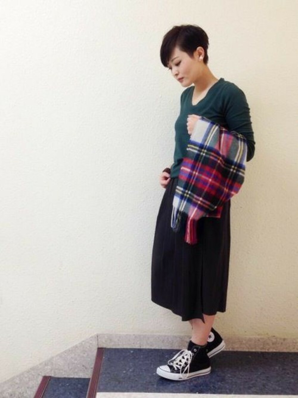 落ち着いた色味にチェックのストールを合わせて明るくしました☆ ギャザースカートには、スニーカーを合わせるとカジュアルダウンしておすすめです^^