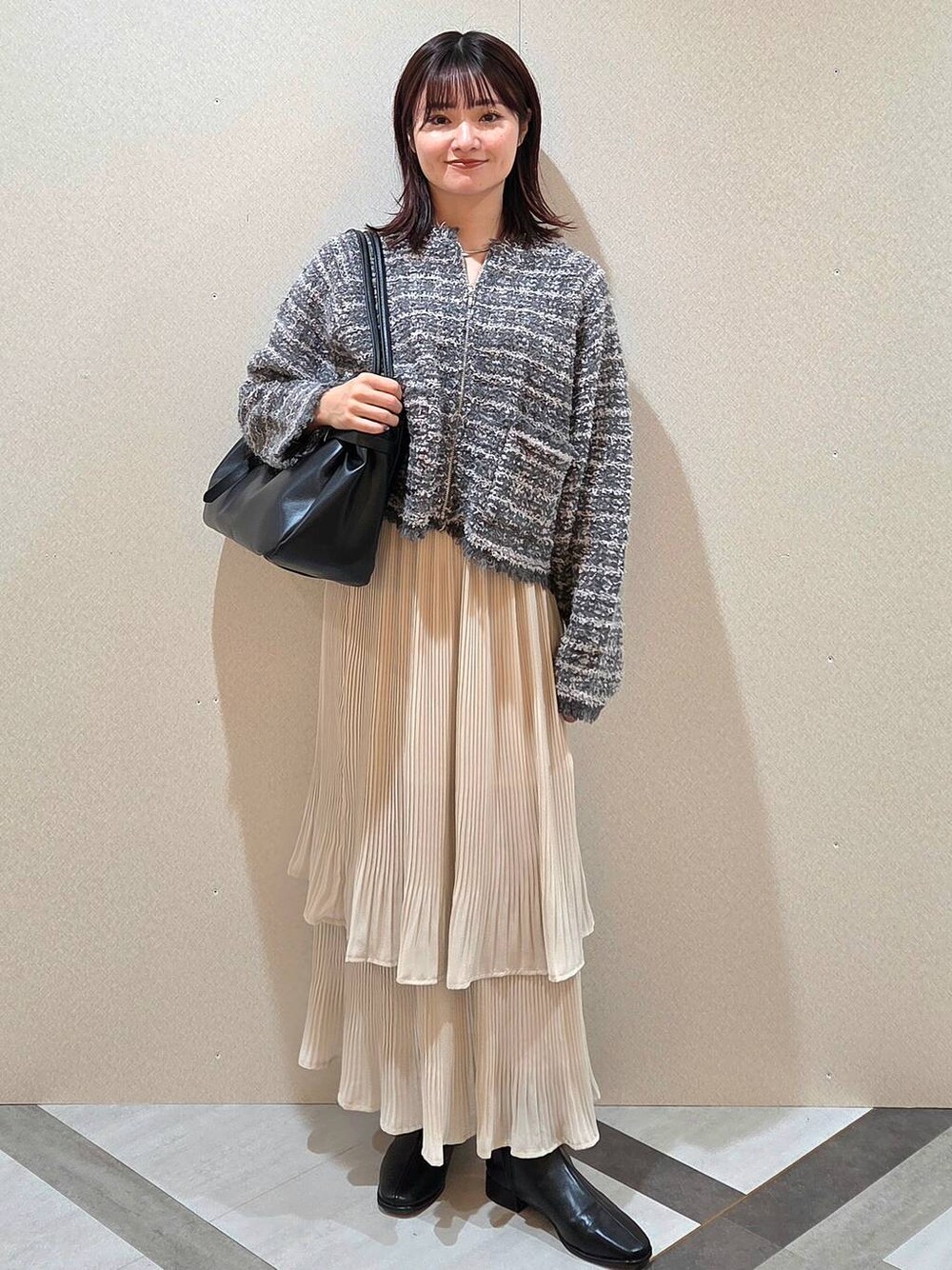 【スタイリングポイント】 1枚で可愛いニットならこれ‼️ ラメ×ツイードで華やかさアップ✨ 【タイプ】 ✔️骨格ストレート ✔️上半身にボリュームが出やすい ✔️お腹周りにゆとりが欲しい 〈トップス〉 低身長さんにうれしい短丈ニット! ハイウエストのパンツやスカート合わせがおすすめです。 ジップ開閉なので、暖かい日はアウターとしても使えます◎ 〈スカート〉 迷ってるならまず試して欲しい‼️名品スカートです✨ ウエストはオールゴムでしっかり伸びます! ティアードが甘めですが、広がりすぎず上品にまとまるのでデイリー使いにもおすすめ☺︎