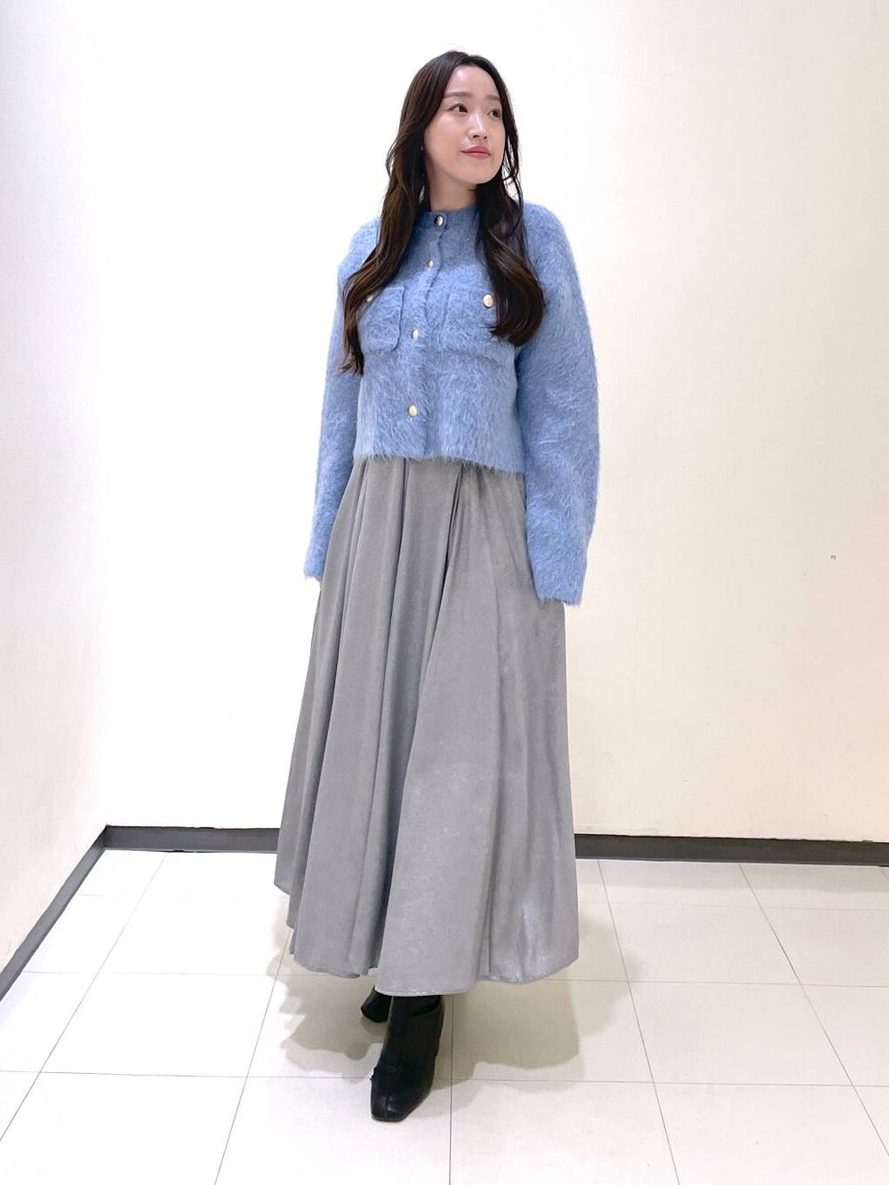 爽やかなブルーカラーのカーディガンスタイリングです。 デザイン性があるカーディガンは一枚で様になります。 アルパカも入っていて暖かく春先まで着れます。 スカートは、156cmでSサイズ着用です。