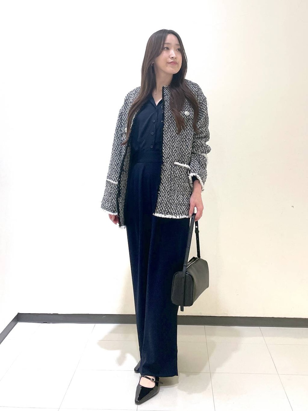 ちょっとシックなスタイリングです。 サロペットは、156cmで足首くらいの丈です。 ウエストゴムでウエスト周りも履きやすく、素材感も柔らかく素材で着やすいです。 ジャケットは、お尻すっぽり被さる丈です。 少しオーバーサイズですが、中も着込めるので今時期から着やすいです。