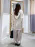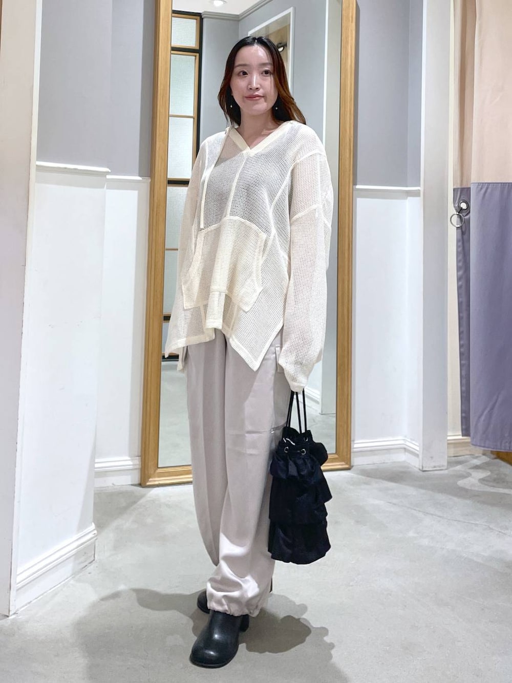 ⭐ゆるカジスタイリングです。  ̄ ̄ ̄ ̄ ̄ ̄ ̄ ̄ ̄ ̄ ̄ ̄ ̄ ̄ ̄ ̄ ̄ 【トップス】 メッシュのフード付きプルオーバーは他にないデザインで、スタイリングにプラスするだけでこなれ感でると思います。ちょっぴりオーバーサイズです。156cmでお尻まですっぽり被さる丈になります。インナーは、今時期はタンクトップ重ねで、もう少し秋めいてきたら、シアーの長袖をレイヤードで着ていただくのもオススメです。サイドにスリット入りなので、ヒップや太もものラインが気になる方もスッキリ着れます。 【ボトムス】 サテン生地で着心地が良いボトムです。 サラッとした素材感で履きやすいです。 156cmで足首くらいの丈になります。 着用時はヒール合わせていますが、ちょっと厚底のスニーカーでもちょうどいい丈感でした。 【バッグ】 思っているよりかは、間口がガバッと開き物の出し入れしやすいバッグです。シンプルだけど、フリルがアクセントになり、大人かわいくコーディネートのプラスになります。500mlのペットボトルは縦で入ります。