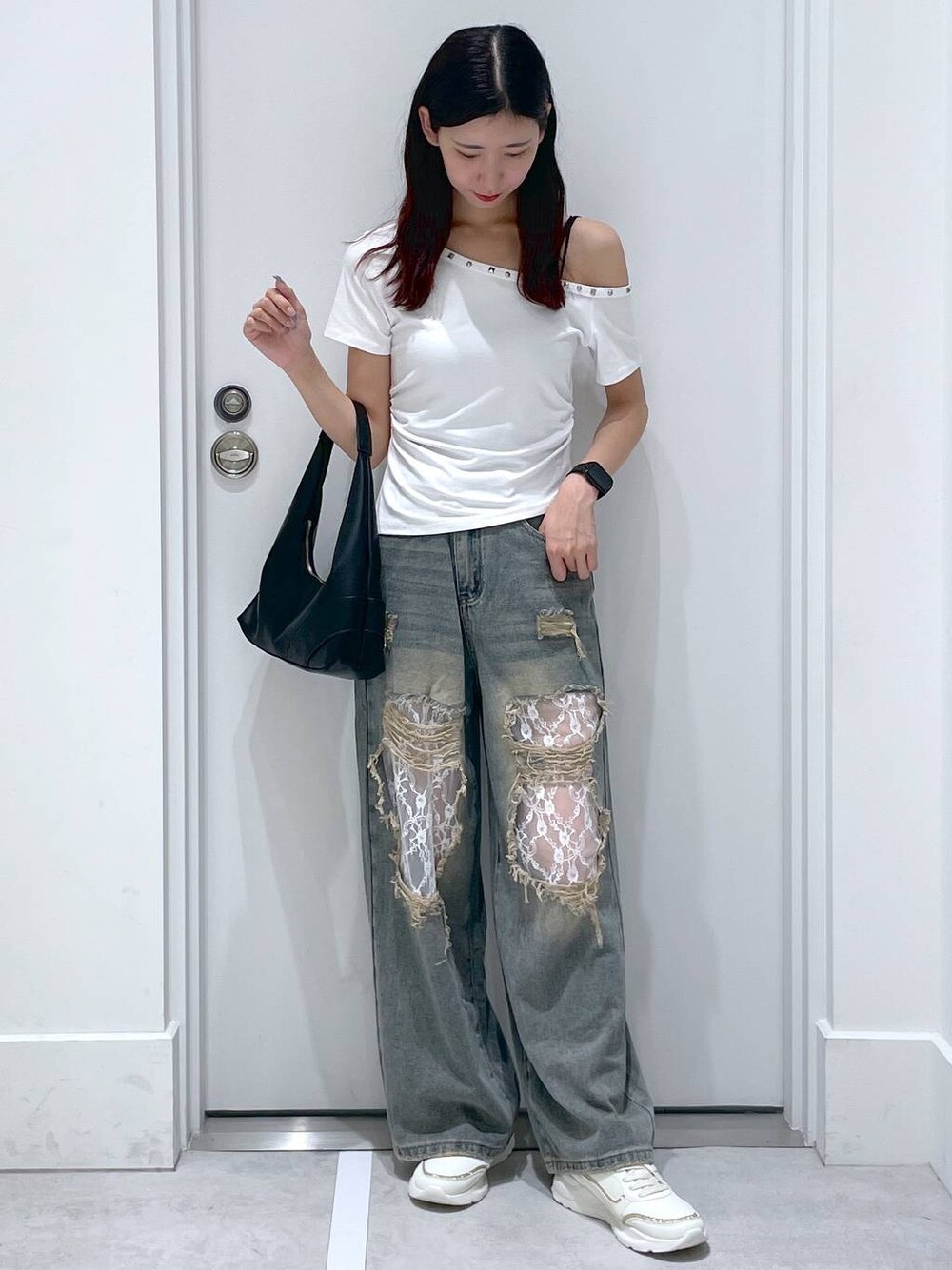 まゆ(FOREVER21 イオンモール大高)のデニムパンツ「【2025SS】ダメージレースデニムパンツ」を使ったコーディネート