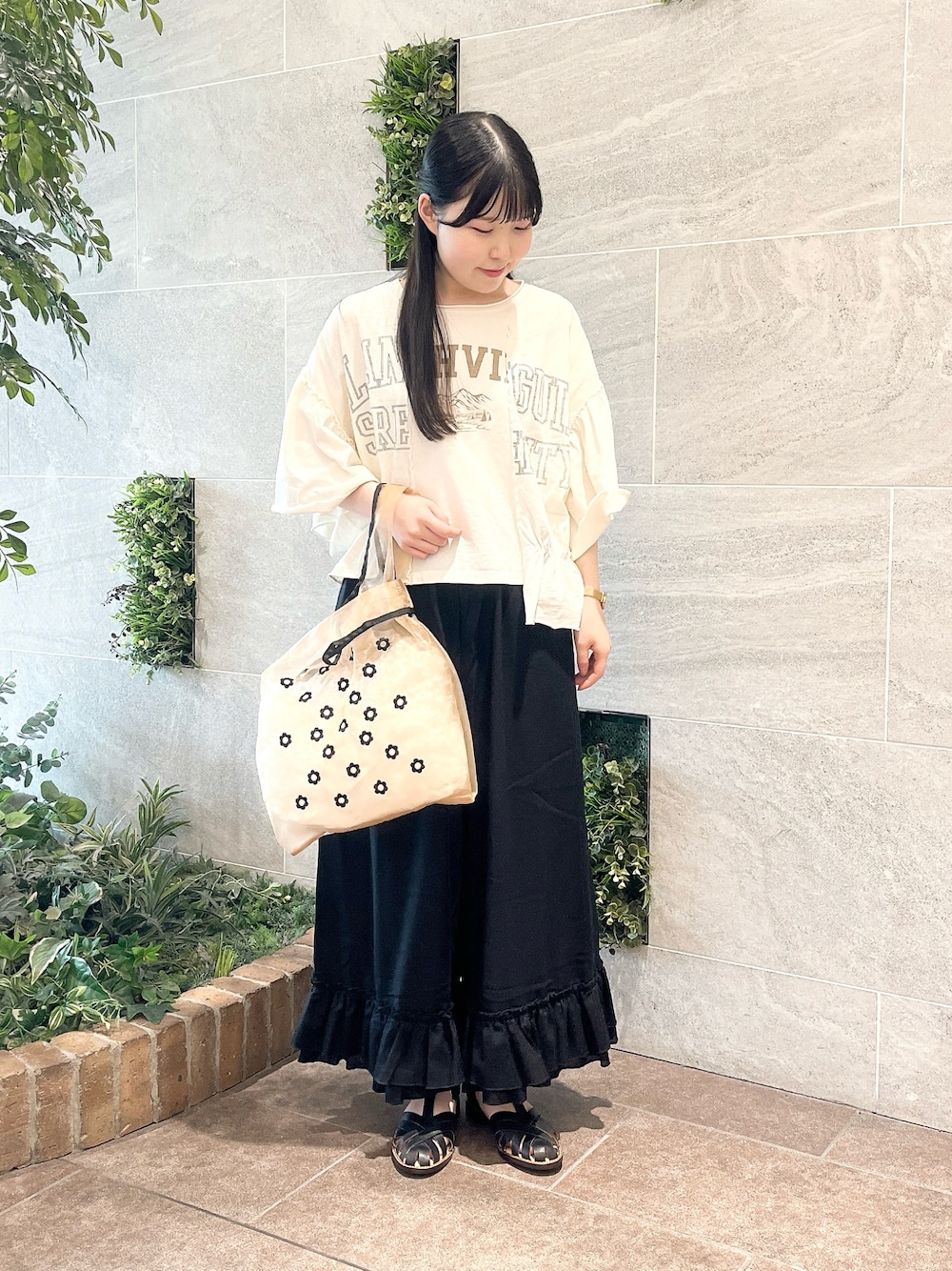 𝗮𝗻𝗻のハンドバッグ「【ポケッタブル】花刺繍シアーマルシェバッグ」を使ったコーディネート