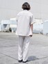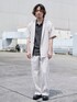 色んなシーン使えるセットアップになります。 食事会、デート、イベント、パーティーなどでご活躍オススメの1着です。 男はシャツ、TEEになると思いますが、こういった羽織物をもっているとコーディネートの幅が増えるのでオススメです。 パンツのレングスも長すぎず裾上げ不要サイズ感でちょうど良いです。