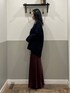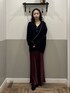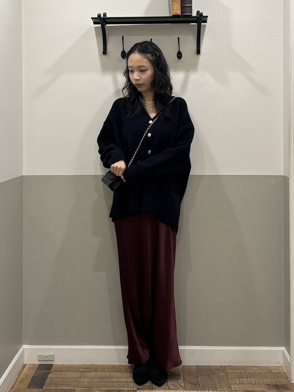 原色だと相性が悪い2色もトーンが暗くなれば😽🤍 カーディガンのネイビーは、寒色🪡 スカートのワインレッドは暖色🍷 もっと突き詰めれば青と赤なのに、トーンが暗くなれば こんな風にまとまりのある素敵なコーデになります✨ APのネイビーは限りなく黒に近い深みのある色ですが、 照明が変わったり火の光に当たると本来の色が際立つ そんなネイビーが多い気がします😌 大人気のカシープ3WAYロングコートも、そんなネイビーなので一度店頭でご覧いただきたいところ🤍 相変わらずお尻がすっぽり隠れるカーディガンにツヤツヤタイトスカートを合わせると 隠したいところは隠れるのに、バランスよく大人っぽいコーデに仕上がりますよね〜🫶🏻 スッキリとした優等生シルエットのアイテム同士なので、 小物でいっぱい遊ぶと楽しい✨