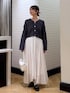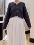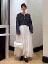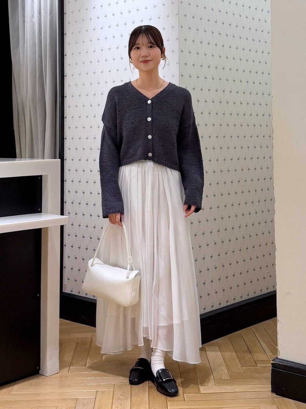 【トップス】 テープヤーンニットのカーディガン サラッとした着心地で、程よく通気性があります🫧 素肌で着てもザラザラ感はあまりありません🪽 ご自宅で手洗いでお手入れ可能です◎ 【スカート】Mサイズ着用 裾のデザインがおしゃれなフレアスカート ウエストは後ろ側がゴムになっていて窮屈なく履きやすいです! 柔らかい素材で履き心地抜群🪽 フレアシルエットがトレンド感◎