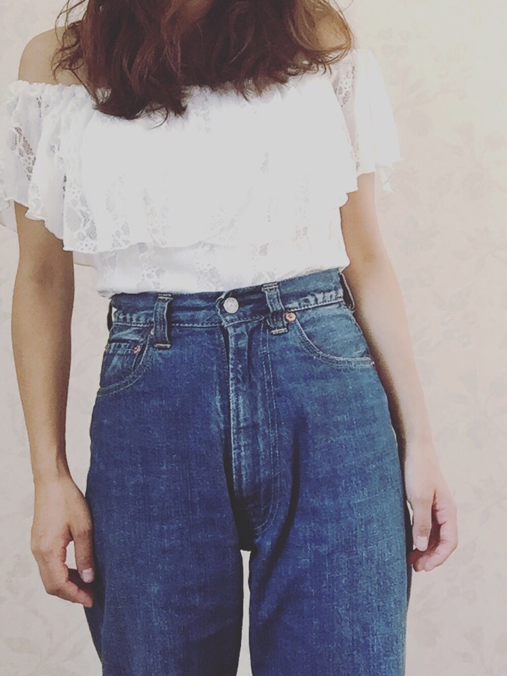秋なのに。妊婦さんから卒業したので、着たかったハイウェストデニムを着まくる〜。ショート丈トップスもやっと着れる〜。