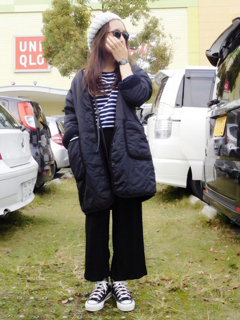 GUのリバーシブルアウターはどちらの面で着ても可愛いです。 この日はニットのベレー帽を被りたかったので、アウターはキルティング側にしました。 低身長の為、ゆるコーデの日はウエストインや靴や帽子、髪型等でバランスを取るようにしています。