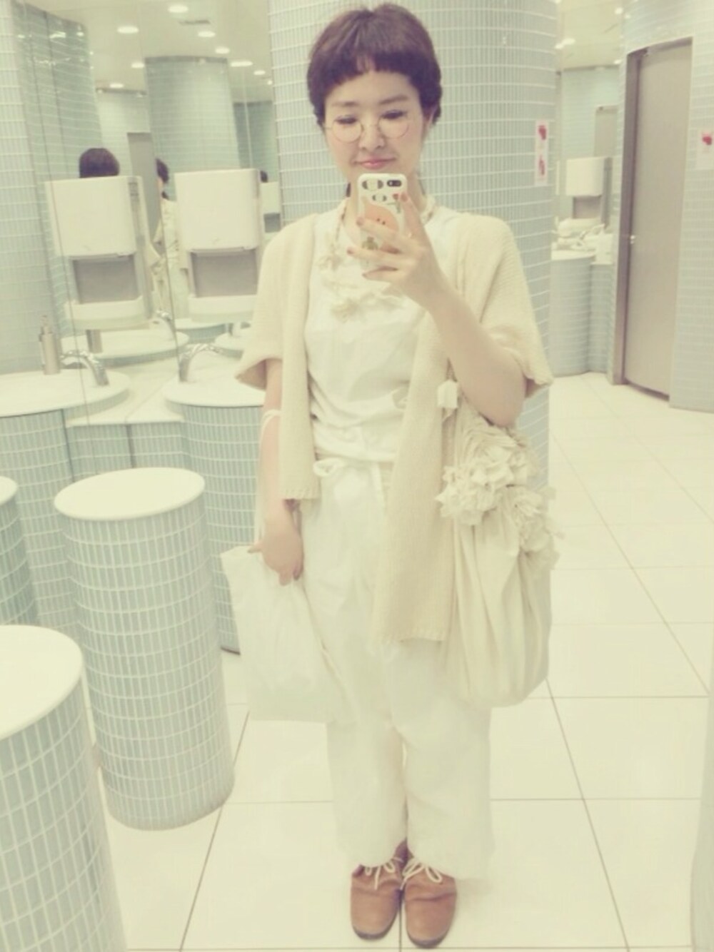 白のカーディガン、、、コムデギャルソン 全身ホワイト 手作りのネックレスは頭に巻いたり、ベルトにもなります♡♡