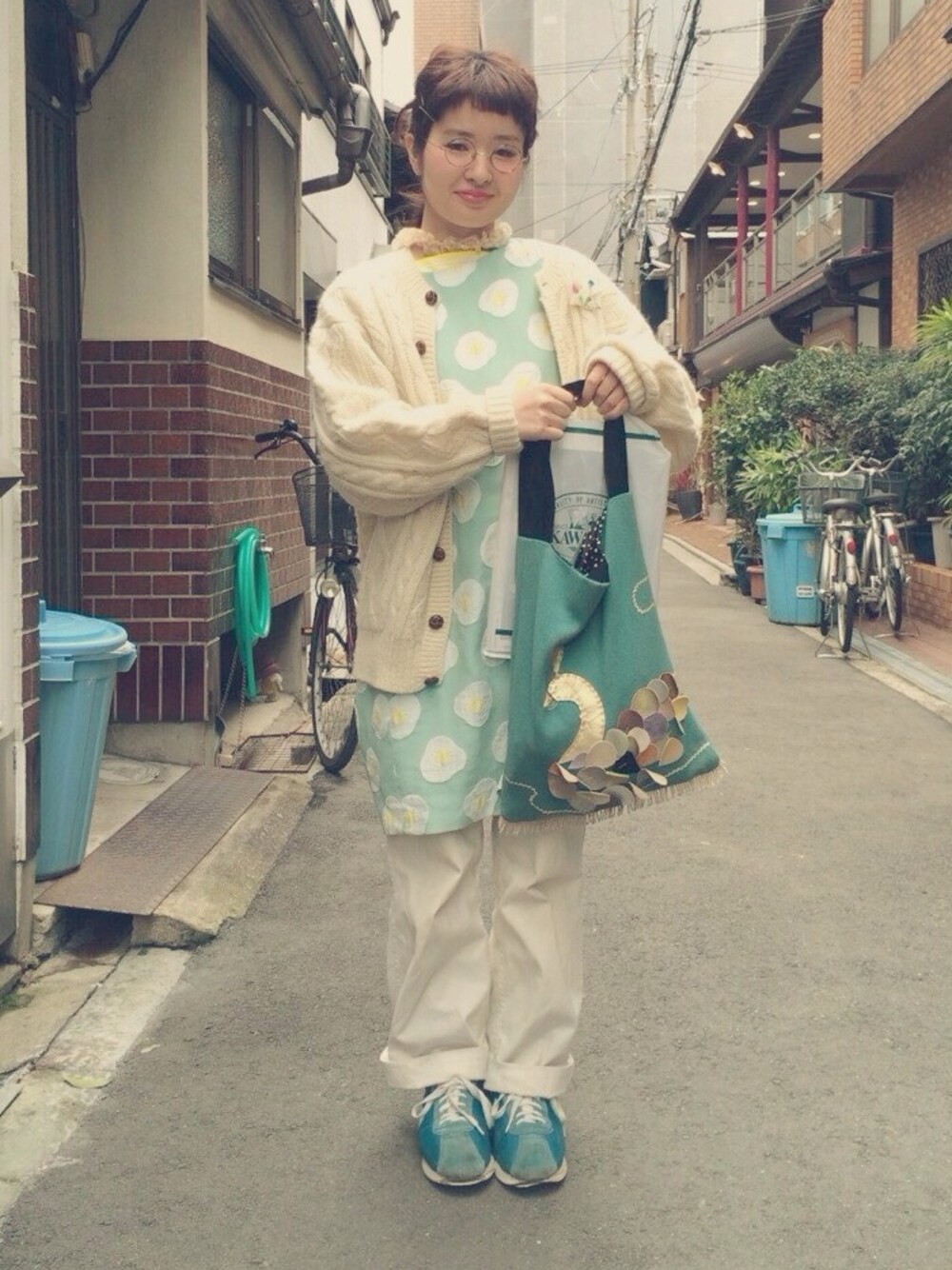 目玉焼きワンピース 白いカーディガン どうしても醸し出してしまう おばあちゃん感、、笑