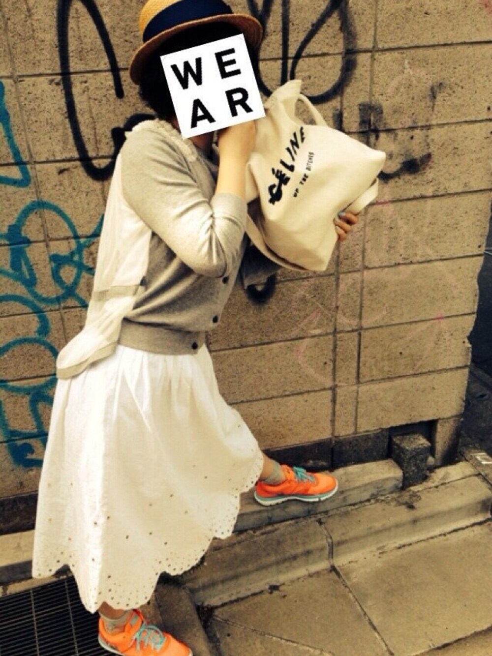ホワイト系のスカート、グレー系のカーディガン/ボレロ、ピンク系のスニーカーを着用したレディースの春コーディネートの1枚目の写真