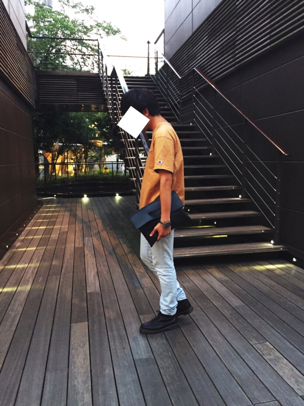 イエローとブルーの優しいテイストにクラッチバッグとマーチンの無骨な黒を加えてメリハリを付けてみました! 場所は青山セントグレース大聖堂の前😋 ちょうど結構式の予行練習(?)が行われていて素敵でした!