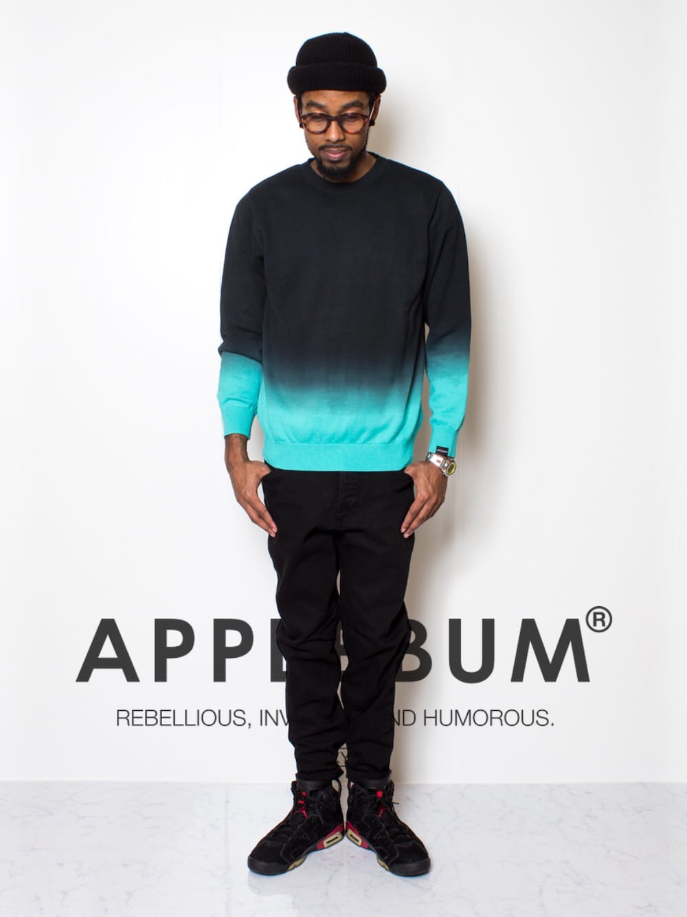 本日はセーターを使用したコーデ◎ グラデーションがかかったセーターは日本の染め職人によるもの。 黒で全体をまとめ、染め感を強調させました! スニーカーにあえて赤の差し色を入れ統一感を出しました。 是非参考にしてみてください!