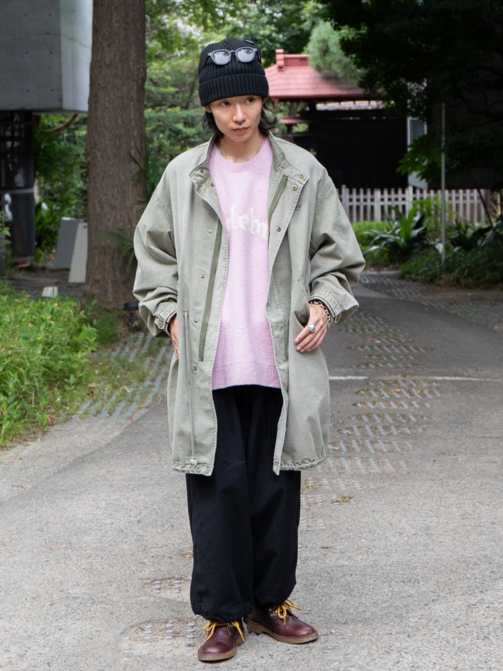 オールドイングリッシュフォントで【APPLEBUM】のロゴをジャガード編みで施したニットセーター。 ストリートなムードが漂うデザインが魅力の一枚です。 インナーを重ねて着用してもゆとりがあり、寒い時期のレイヤードスタイルにもぴったりです。