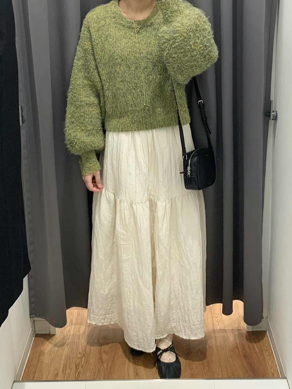 春を意識してグリーンのニットとアイボリーのスカートを合わせてみました🕊‪🌱‬ 甘くなりすぎるので小物はブラックでまとめました🫡 パンプスにシアーソックスを合わせているのもポイントです🤍