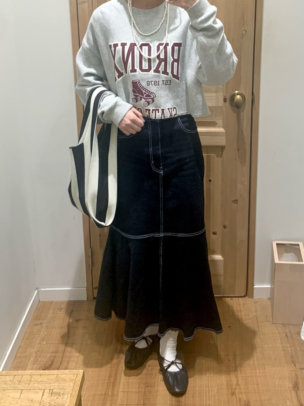 ローリーのスウェット着心地良すぎて高頻度で着てる🫣🎶 デニムのマーメイドスカートは形綺麗すぎて めちゃくちゃスタイル良く見えます(^ω^)♡