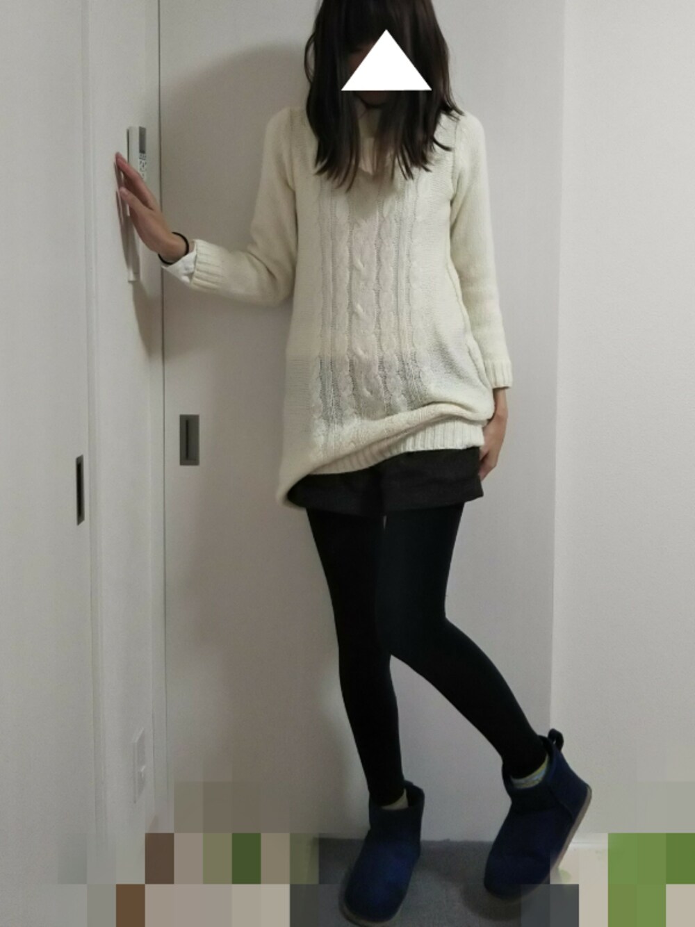 ホワイト系のワンピース、ブラウン系のその他パンツ、ブルー系のブーツを着用したレディースの冬コーディネートの1枚目の写真