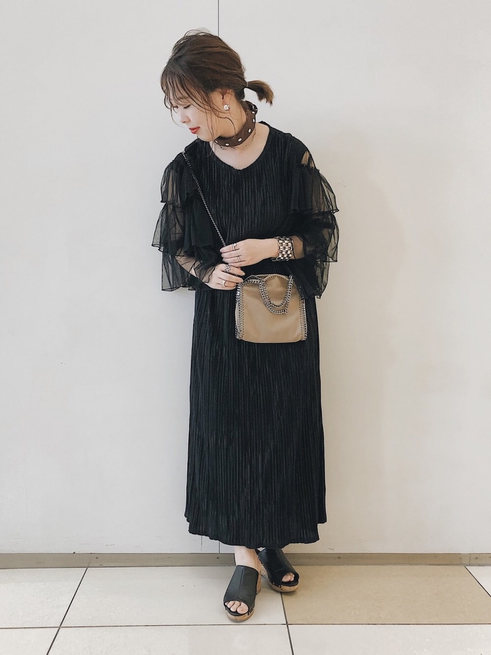 トレンドのスカーフ 首巻きアレンジ💛💛 シルバーのスネークチョーカーとの重ね付けがマイブーム中💛💛 秋色なスカーフが欲しくて zozoのサマーセールで買いました🗃✨ 夏のブラックコーデは透け感を使うと暑苦しくなくて良い💛💛って、ヒルナンデスのファッションチェックで植松さんが言ってた📺✍️ あのコーナー好き(笑)