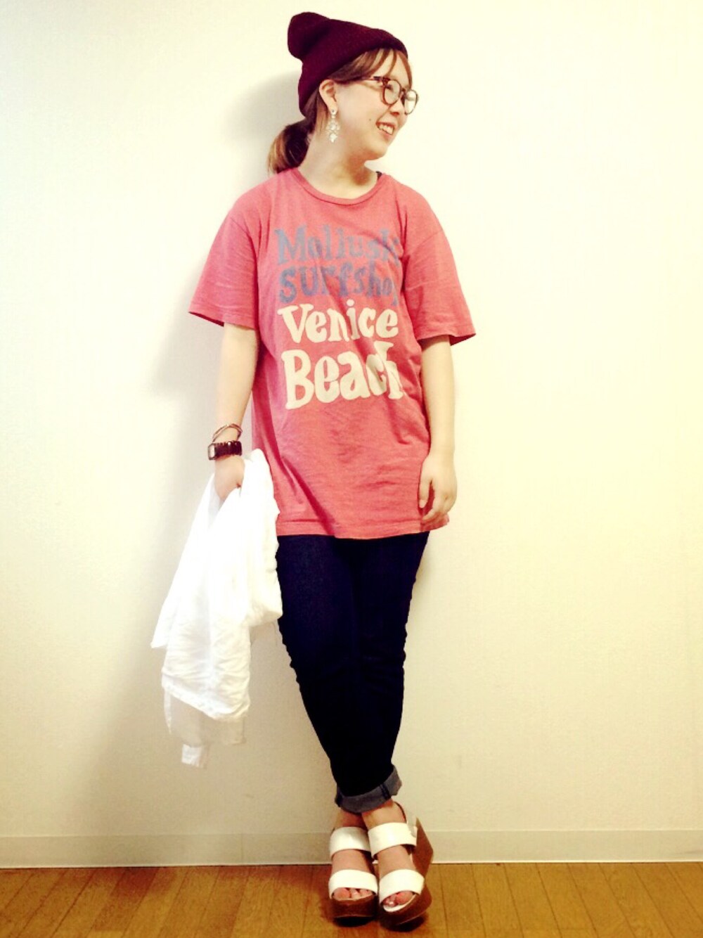 トーンの違う赤でニット帽をあわせて メンズTシャツのゆるコーデ◡̈⃝︎⋆︎* スニーカーではなくヒールをはきたかったので👡💕 ピアスはキラキラなものをあわせました✨(^ω^)✨ 目線の先にチャイがいて思わず笑っ🐶💕