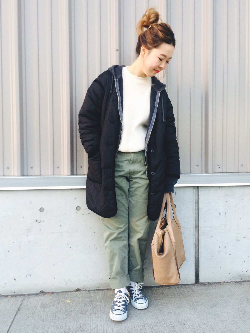outer▷GU pants▷UNIQLO▷men's parka▷Factor= shoe▷CONVERSE お正月🎍SALE UNIQLOでみつけたチノパン😉⌒❤︎ 淡いカーキ色がタイプ お値段みて即買い😘⌒❤︎ この日は参拝へ🙏 寒さ対策はGUのキルティングジャケット×Factor=のパーカーをレイヤード☃️🍃