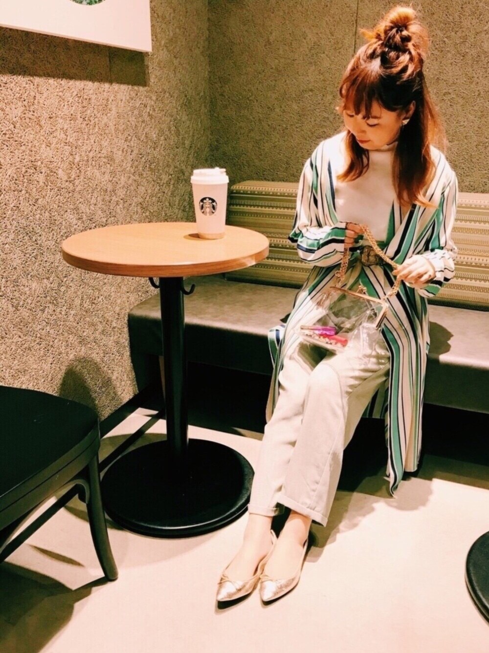 🌈おはようございます☂️ green+gold+White WEARでも大人気の、 clear bag をgetしました⌒💜 わたしは💁 少し容量の多そうな がま口タイプにしました⌒💜 shirt----->used tops----->Factor= pants----->used bag----->nobrand shoes----->GU earring----->dalii----->Instagram Instagram accessory掲載中✍️◎⌒💜