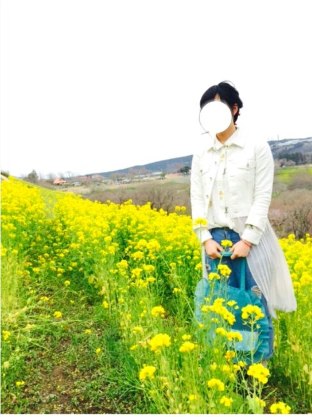 初投稿です。 菜の花畑に行くコーデ 白いジージャンの後にはプリーツがついてます お気に入りです。