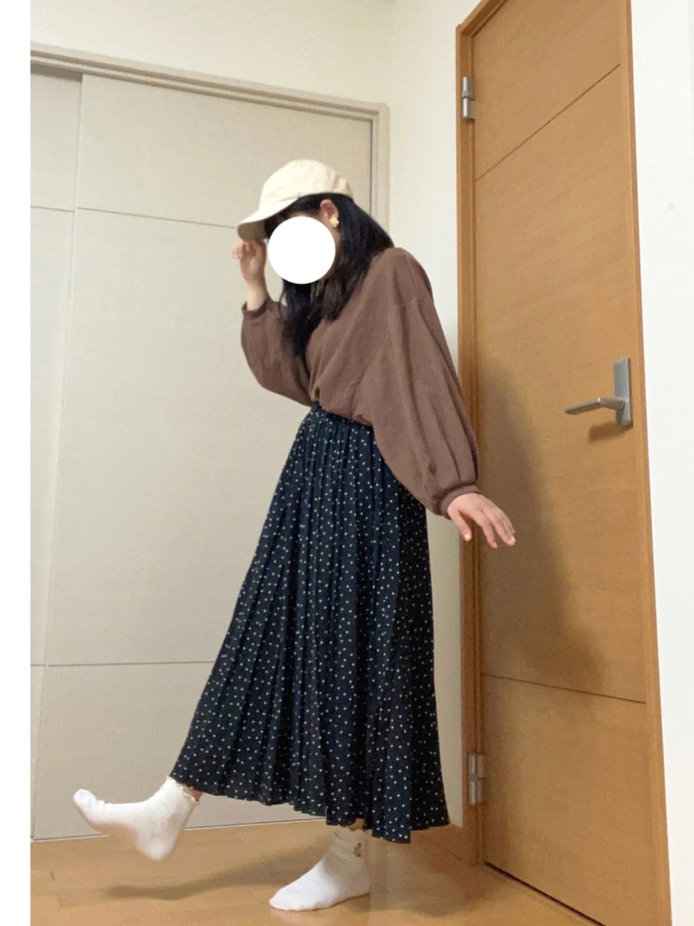 こんにちは!ぽっくるです🌱 今日は、しまむらコーデ! ○ブラウントップス🧸 ・秋らしい色 ・大好きな袖たっぽり ・Uネックで可愛い印象に ・さりげないロゴが可愛い! ○水玉スカート ・ヒラヒラ感👍🏻 ・裏が付いているので、中が透けません! ・ウエストはゴム ・サラサラ生地で通気性ある😚 ○帽子はNew Balanceです! 色可愛いし、水色のロゴで一目惚れ 後ろはベルトみたいになってて調節しやすい! ○イヤリングは3coinsです😳