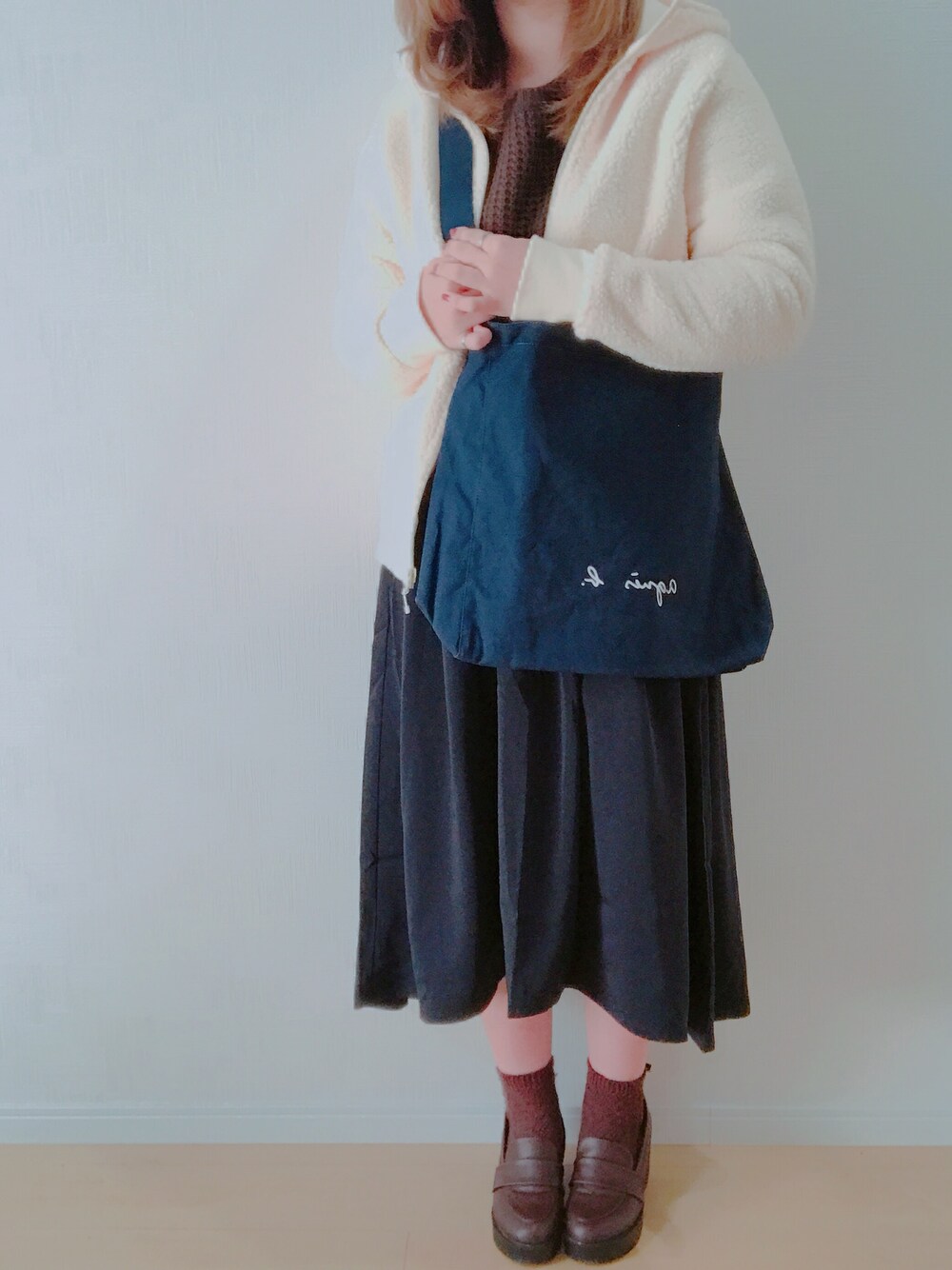 こんばんは🌙 すずでーす٩(*´◒`*)۶ みなさまいかがお過ごしですか?💭☺ すずはお休みです😆 もう少しで12月も 終わっちゃいますね。。 最近1日がほんとに早くて、、 2018年もあっという間に…🙁 はい!本日はですね。。🔥 アニエスベーの ショルダーバッグですよ!!🙋🏼♀️✨ 肩がけしても使えそう☺ 念願のです。。 この前ZOZOTOWNで ゲットしちゃいました🤭💭 ずっと欲しくて、、 ネイビーですこれは☺ めちゃめちゃかわいいし、 おすすめです(﹡'ω'﹡)❅*॰ॱ これからたくさん使いたいです💙 コーデのポイントは、、 トップスのワッフルニットの ブラウンに合わせて靴下もブラウンで コーデがまとまって見えるように🐻 それでは☺👋 いつもありがとうございます✨ これからも仲良くしてください🍀