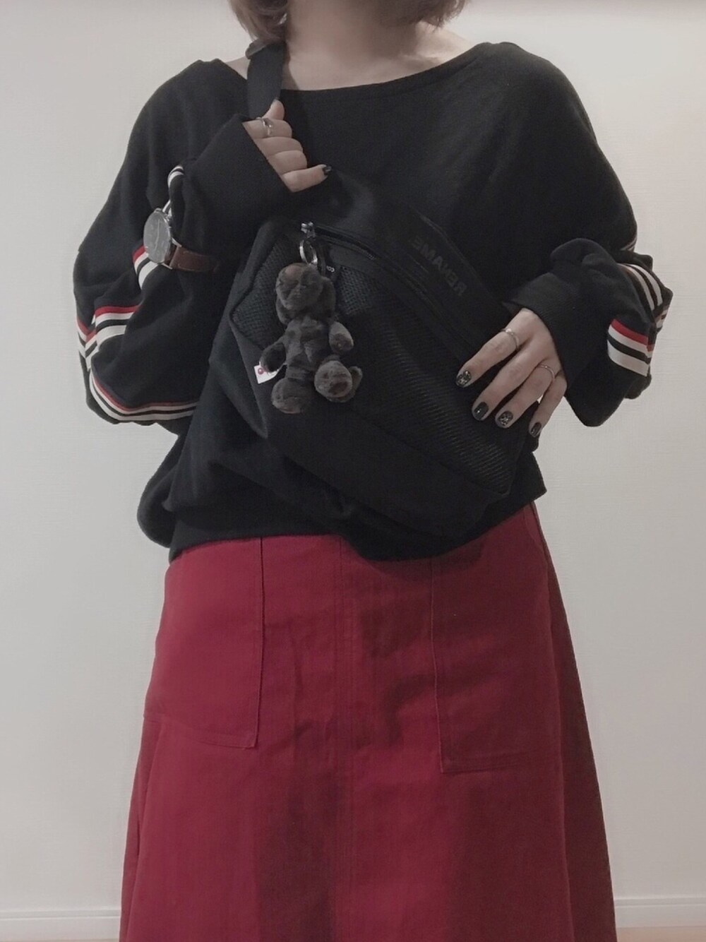 ・ ・ ・ 黒×赤 カジュアル×スポーティー 赤って雰囲気一気に変わるからよき。。 ▹▹▹Instagram:01__suzu1031
