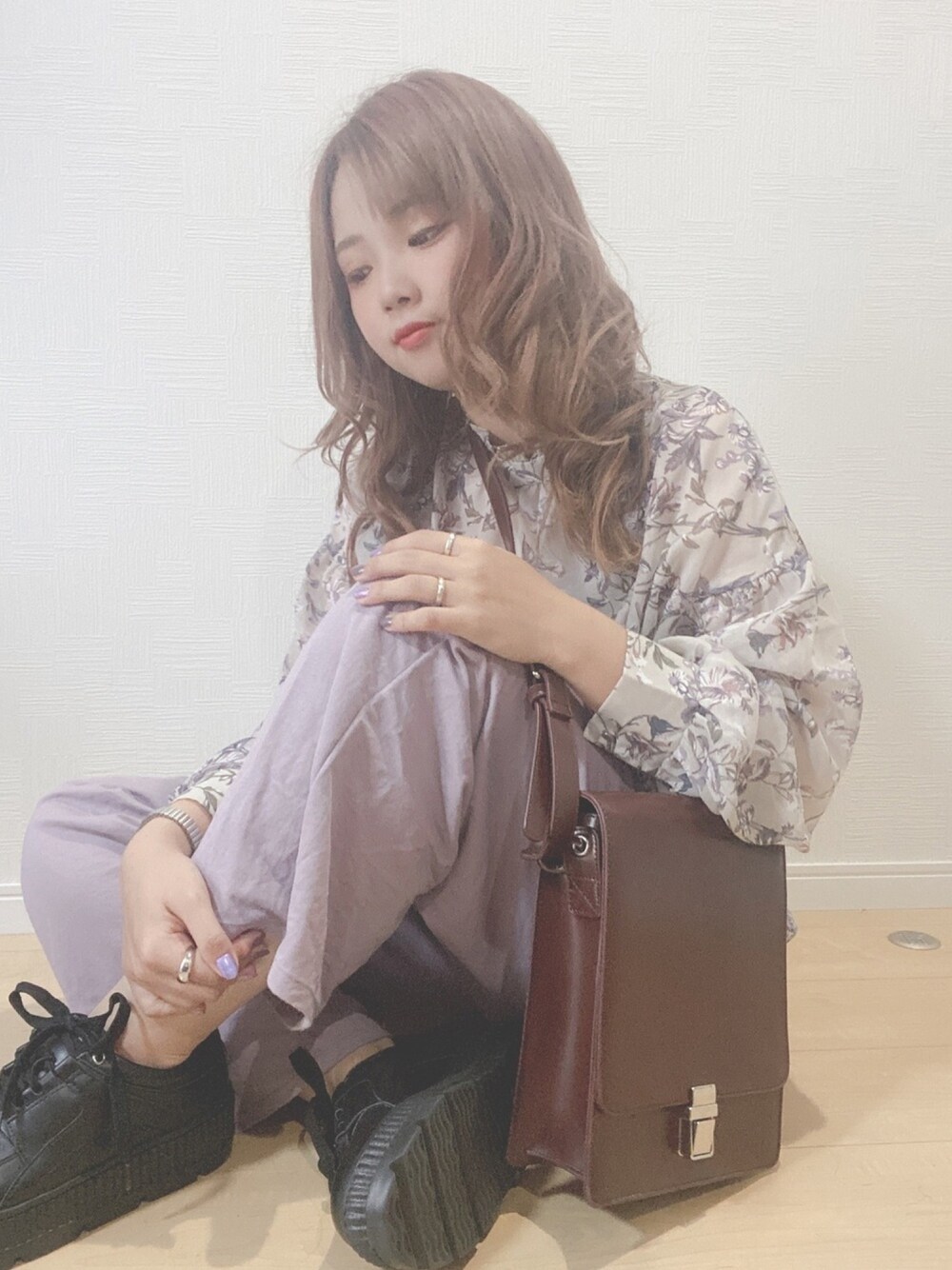 ・ ・ ・ 同じ服でも 髪色で雰囲気変わるね🤞🏻 花柄シャツよきよき🌸 爪もパープル!!!💜
