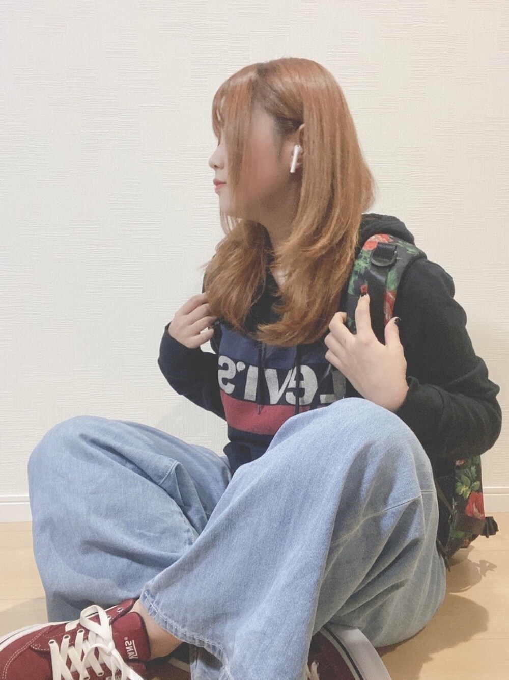 ・ ・ ・ パーカー×デニム×リュックで カジュアルコーデ✌🏻 それぞれのアイテム、赤をポイントに🍎