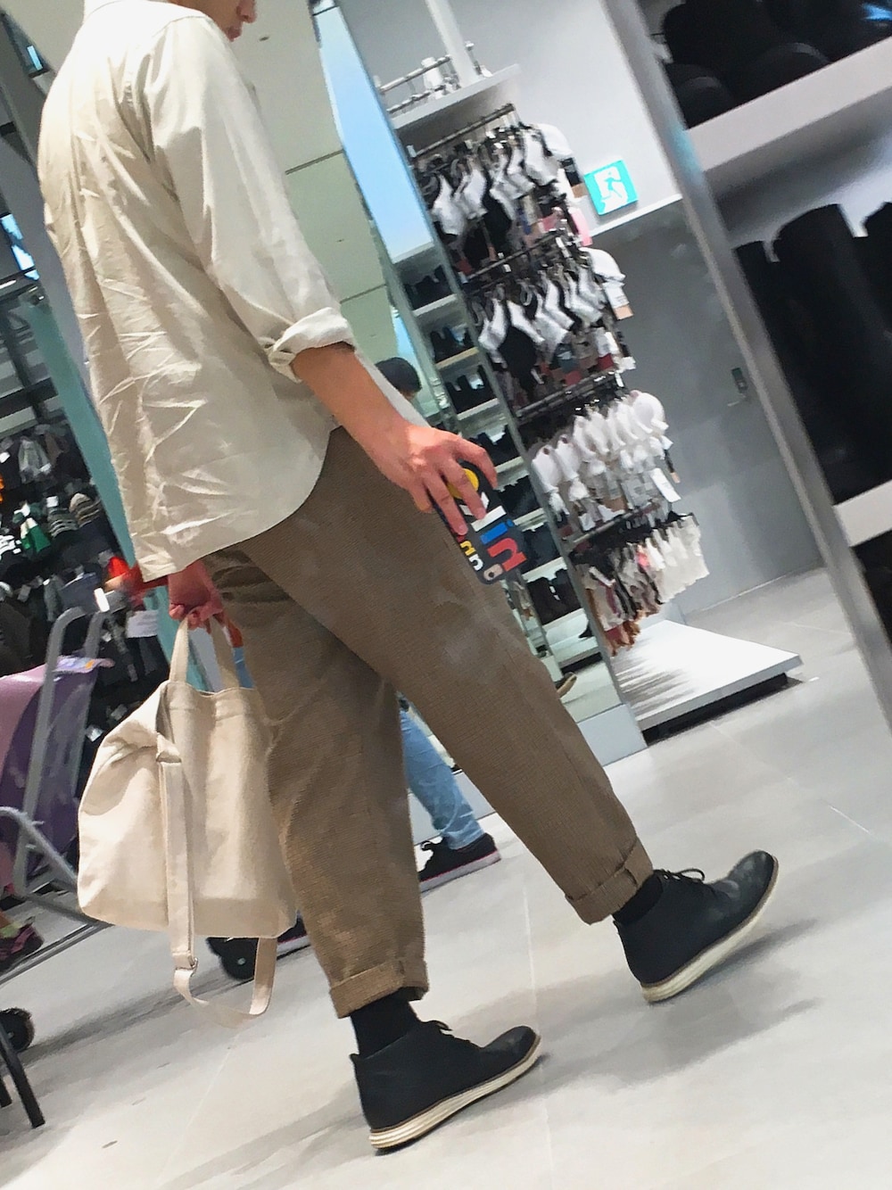 初投稿です。 Melan Cleugeスタッフの飯田です。 今日のバイト着です。 全体的に茶系で合わせて、靴でビシッと黒を入れてまとめてみました。 ちなみに下のチェックパンツはレディースです。サイズ感良さげ。 しかし、シャツシワシワ。