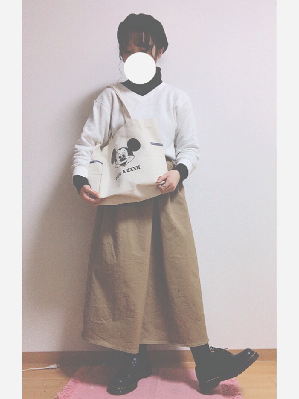 見えにくいですが 前髪 を 模造作 に くるくる 巻いてます 𓂅 mini の 付録 の ミッキートートバッグ に 合わせて、 シンプルなコーデ 🐭