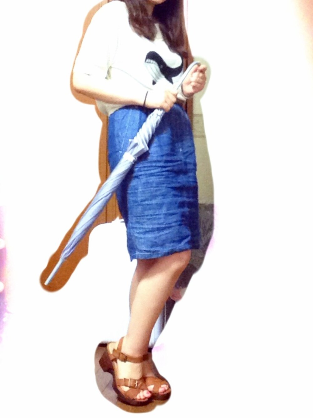 久しぶりのタイトスカート◎ 見えないけどブラウンのベルトしてサンダルと統一感を出したつもりです(´・_・`)笑 これで出勤しまーす\\\\└('ω')」////