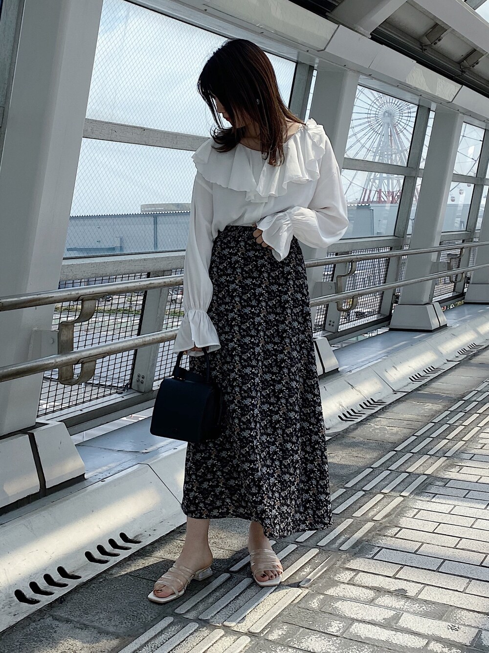 人気のラッフルエリブラウス 着こなし➂ スカートと合わせるて大人カワイイ印象に🤍