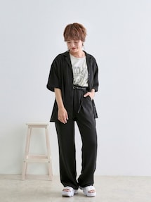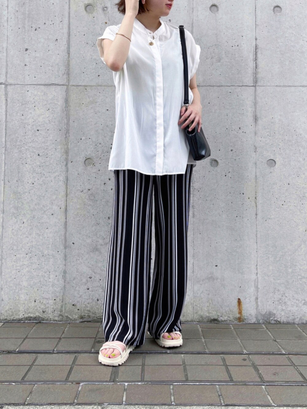 今週発売の新作 【マルチストライプニットパンツ】 【バンドカラーフレンチシャツ】 を使ったコーデ❤︎ 今日からマルチストライプシリーズを 使った着回し6選を紹介して参ります💁🏻♀️💓 ①ブラック×パンツ シンプルな大人モノトーンコーデ🖤🤍