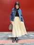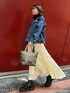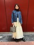 ノーカラーのデニムジャケットとロングスカートのシンプルコーデです。タートルネックを合わせてキレイめにまとめました。 歩くたびに動きの出るスカートは、スニーカー合わせもおすすめです♪