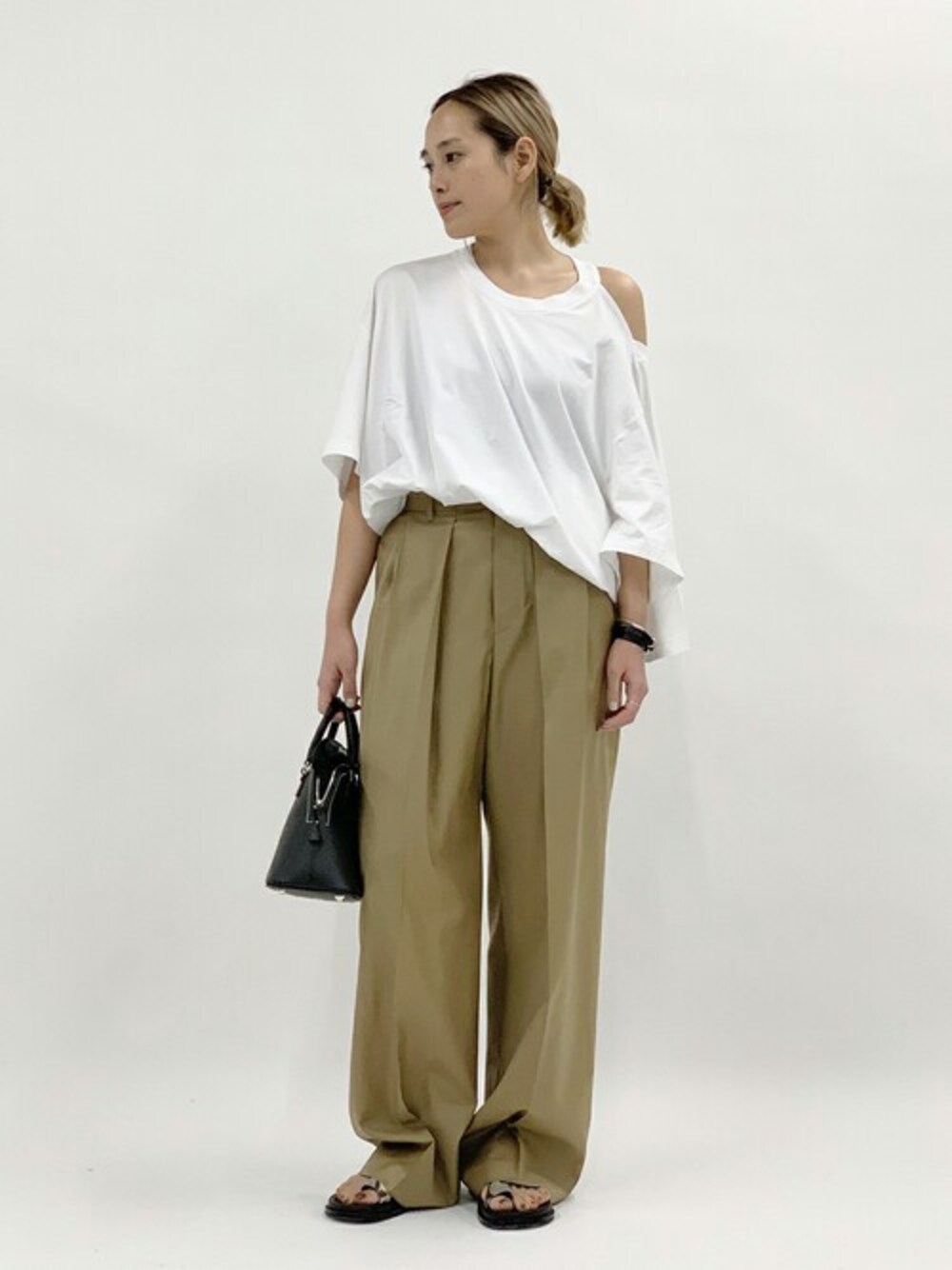 MAISON MARGIELA のトップスに今期気分のクリーンでモダンでエレガントな雰囲気のタックパンツを合わせて。