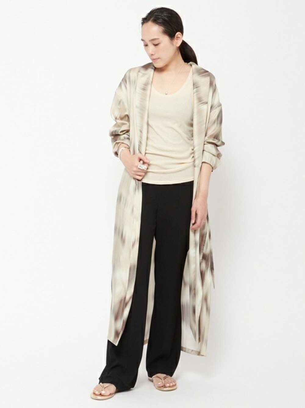 形を1から作った完全別注のCHICS 別注 long gown。 AP STUDIOならではの別注柄で他にはない雰囲気のある1枚。 さらっと滑らかな履き心地のパンツと合わせて、 今年らしいリゾートスタイルをモダンなバランスに。