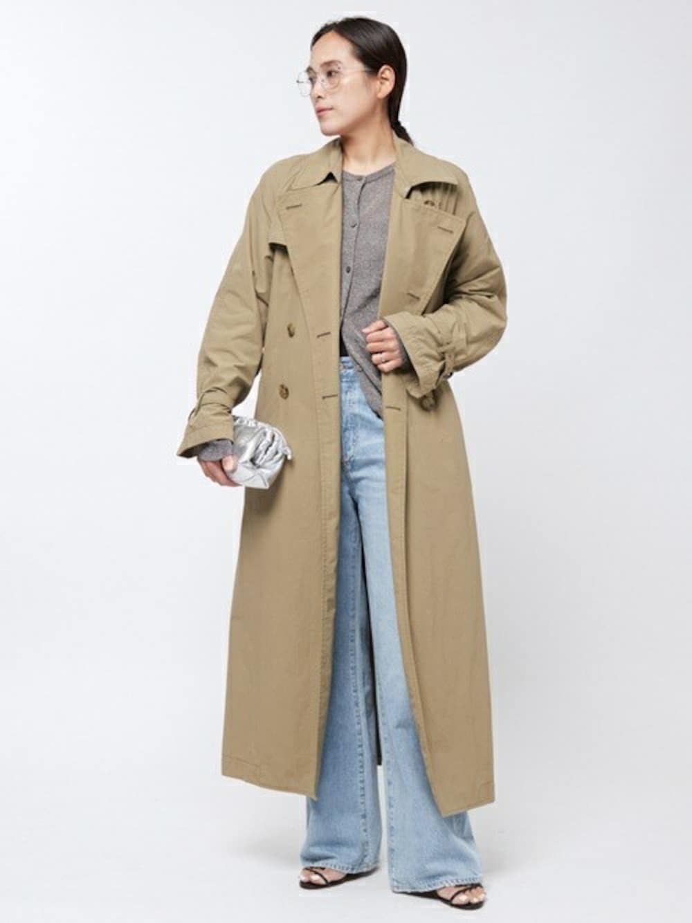 生地感に拘ったナイロン素材のトレンチコート。 まじめになり過ぎず、こなれた印象に仕上がる優秀な1着。 インナーはグリッターカーディガンをアクセントに。 足元はサンダルで抜け感をプラスした、端境期に楽しみたいモダンスタイル。